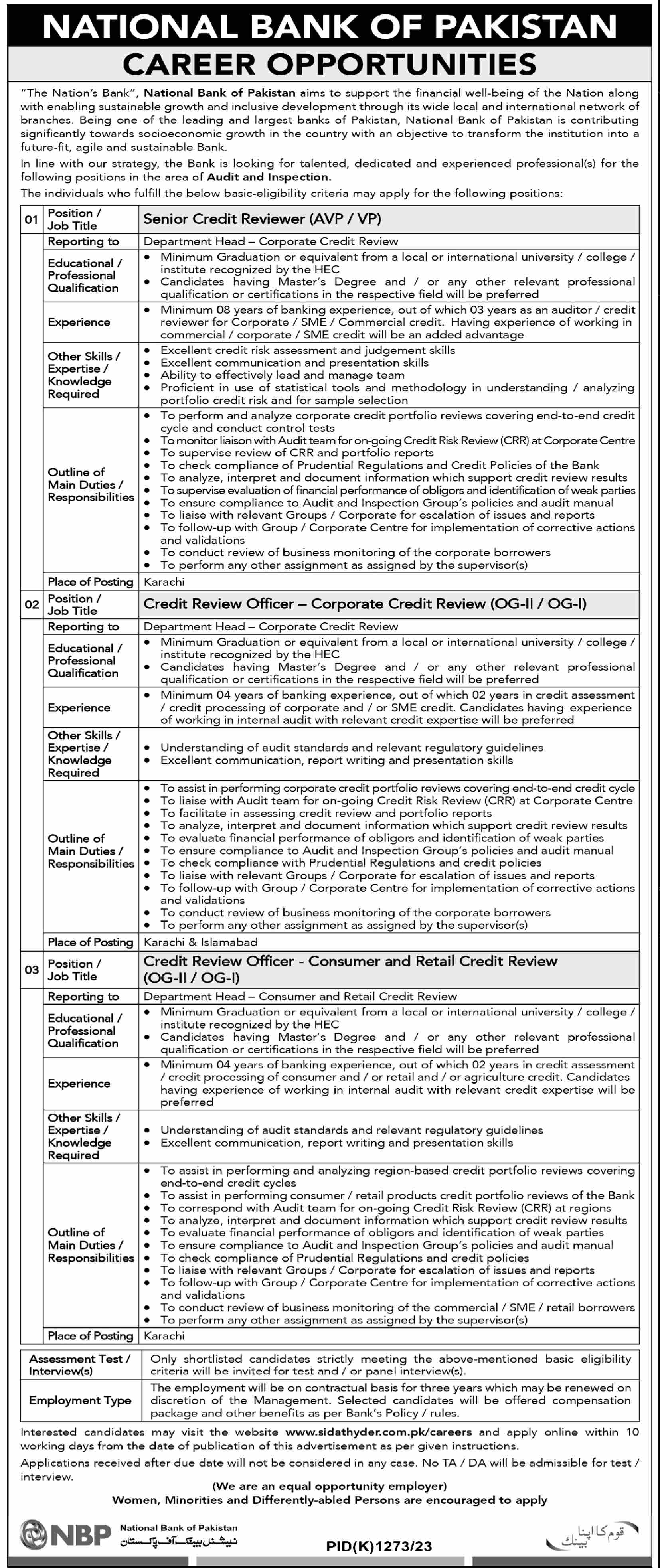 NATIONAL BANK OF PAKISTAN CAREER OPPORTUNITIES "The Nation's Bank", National Bank of Pakistan aims to support the financial well-being of the Nation along with enabling sustainable growth and inclusive development through its wide local and international network of branches. Being one of the leading and largest banks of Pakistan, National Bank of Pakistan is contributing significantly towards socioeconomic growth in the country with an objective to transform the institution into a future-fit, agile and sustainable Bank. In line with our strategy, the Bank is looking for talented, dedicated and experienced professional(s) for the following positions in the area of Audit and Inspection. The individuals who fulfill the below basic-eligibility criteria may apply for the following positions: Senior Credit Reviewer (AVP/VP) Department Head - Corporate Credit Review Minimum Graduation or equivalent from a local or international university / college/ institute recogni...